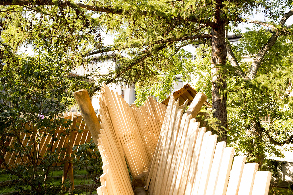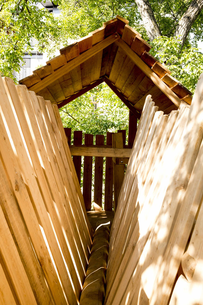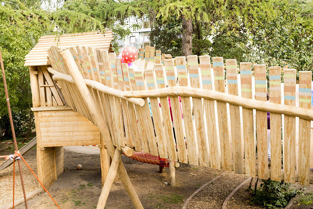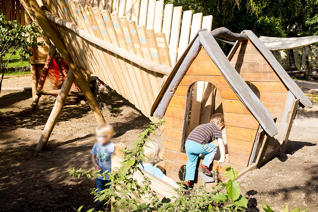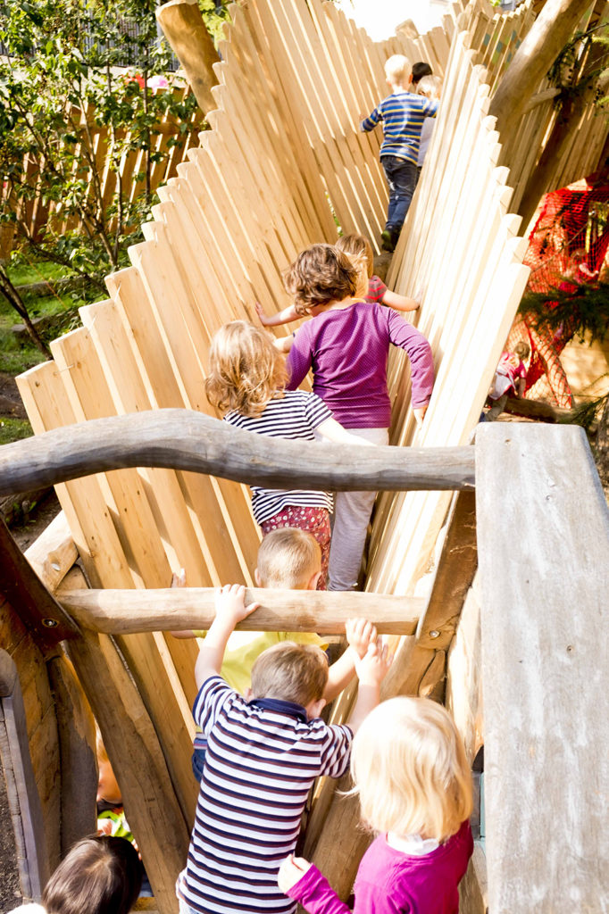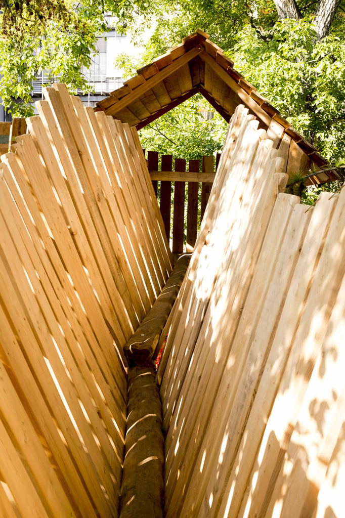 In dem Spielobjekt wurden die neuen Elemente in die bestehende Baustruktur und in die vorhandene Terrasse integriert. Alte und neue Elemente verschmelzen zu einer Einheit. Durch diese Erweiterung wurde die gesamte Spielfläche verdoppelt und es entsteht eine völlig neue Perspektive zum Garten. Die Kinder sollen im Spiel die Höhe und auch ihr Empfinden für den Raum sensibilisieren. Das Objekt besitzt verschiedene Ein- und Ausgänge und diverse Strecken. Es ist so konzipiert, dass die Kinder dabei in Kontakt kommen, sich berühren, aneinander vorbeilaufen (Kontaktspielgerät). Es lädt zum Verstecken und zum Entdecken ein.