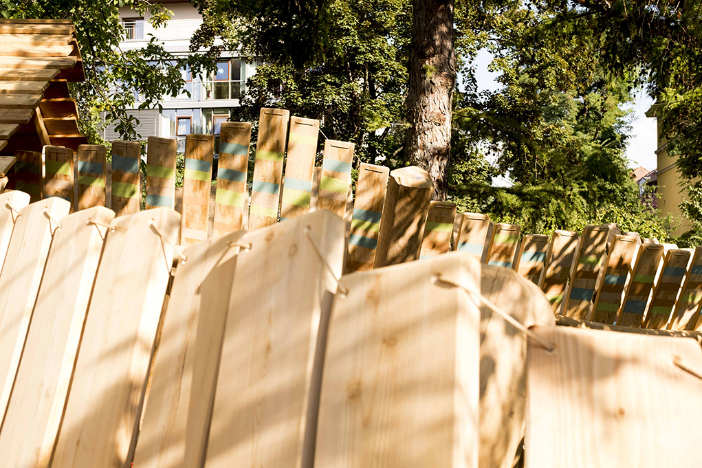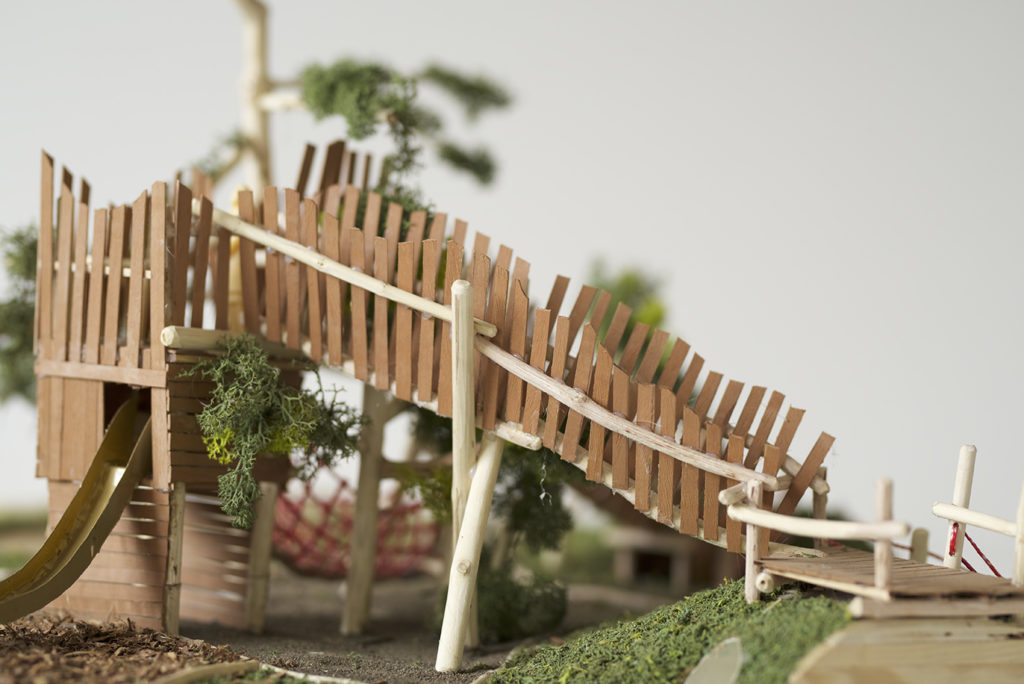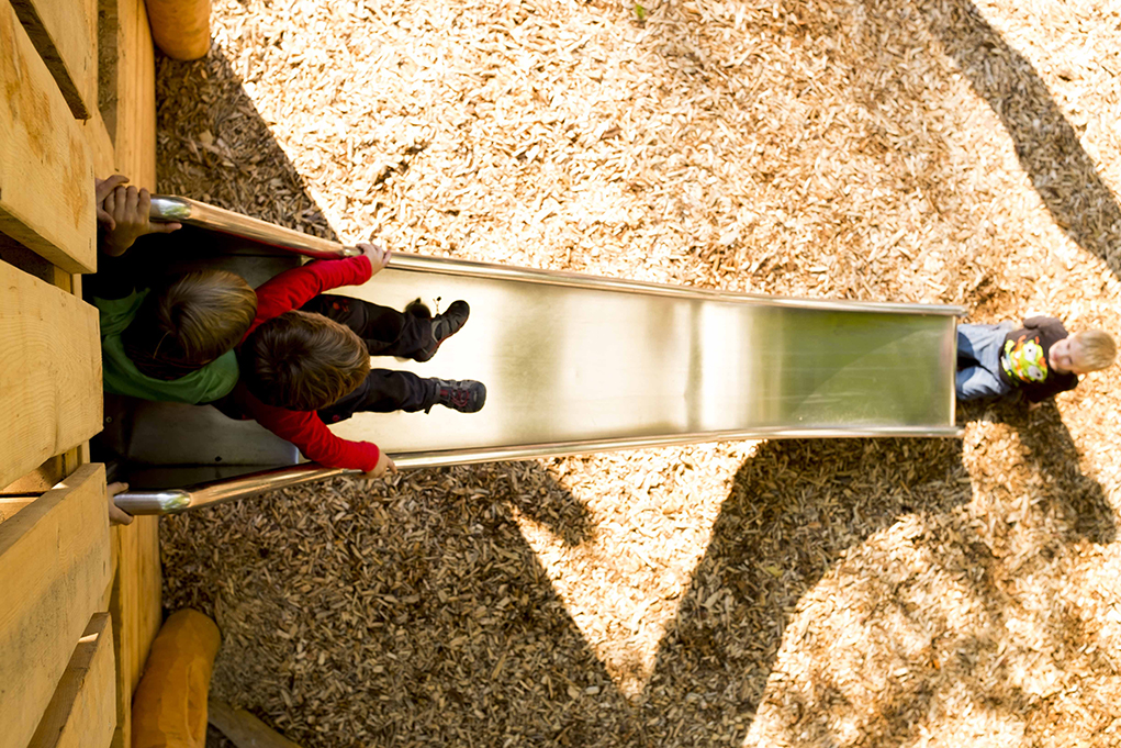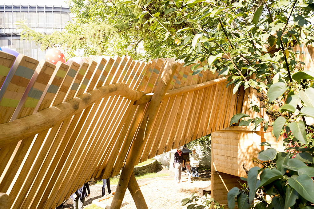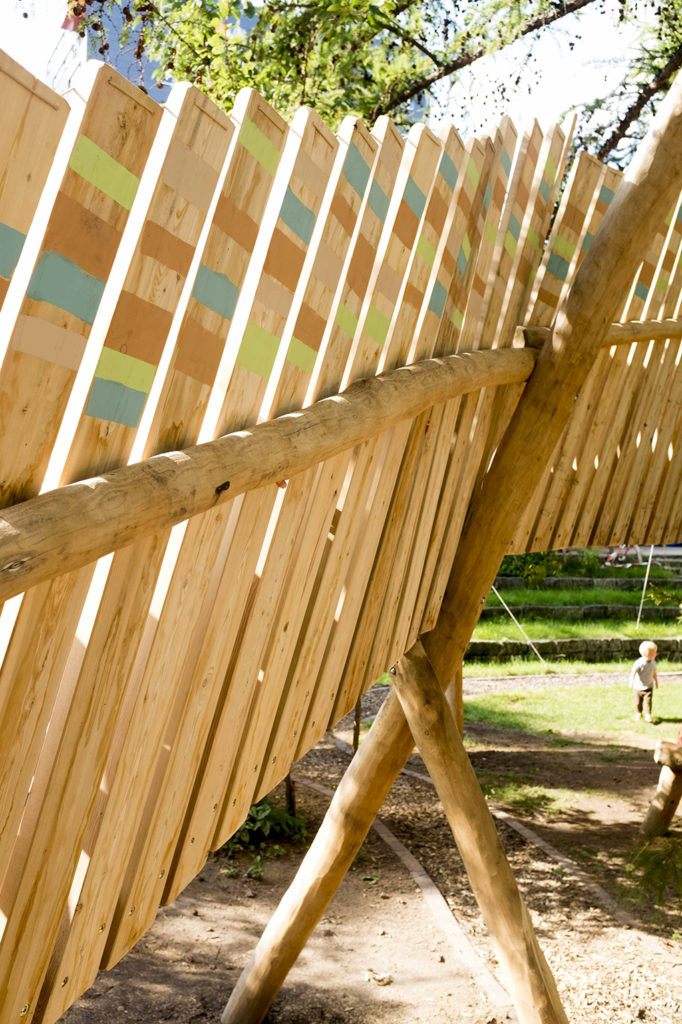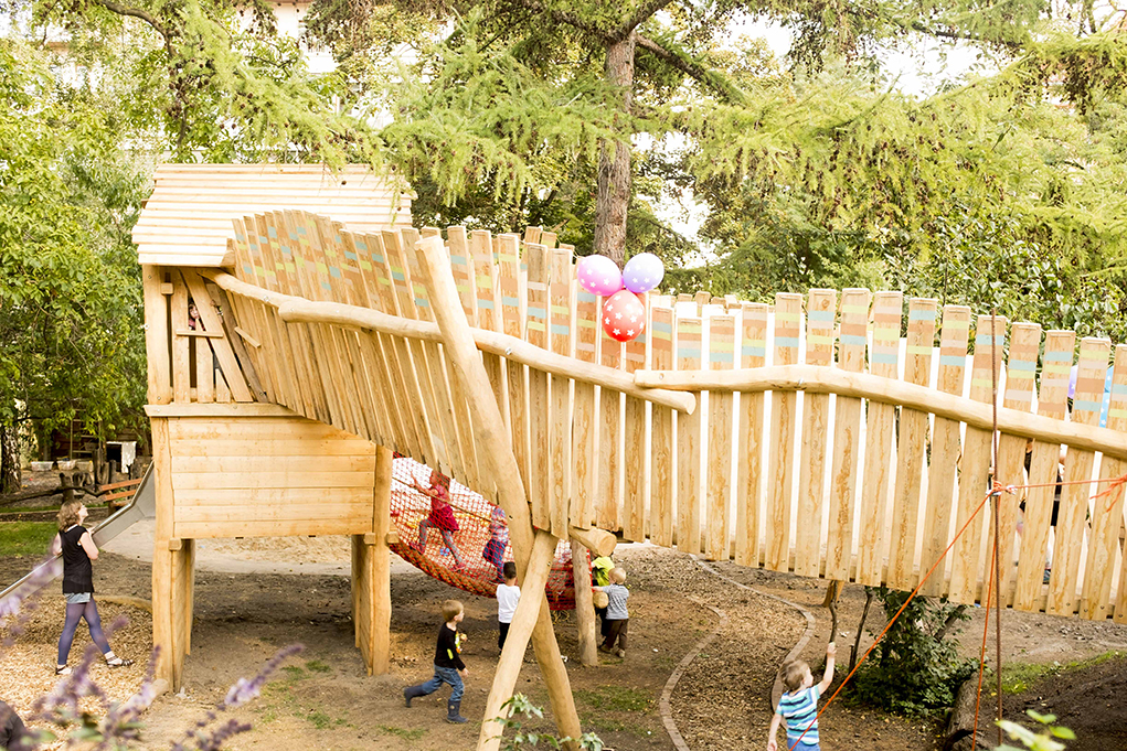In dem Spielobjekt wurden die neuen Elemente in die bestehende Baustruktur und in die vorhandene Terrasse integriert. Alte und neue Elemente verschmelzen zu einer Einheit. Durch diese Erweiterung wurde die gesamte Spielfläche verdoppelt und es entsteht eine völlig neue Perspektive zum Garten. Die Kinder sollen im Spiel die Höhe und auch ihr Empfinden für den Raum sensibilisieren. Das Objekt besitzt verschiedene Ein- und Ausgänge und diverse Strecken. Es ist so konzipiert, dass die Kinder dabei in Kontakt kommen, sich berühren, aneinander vorbeilaufen (Kontaktspielgerät). Es lädt zum Verstecken und zum Entdecken ein.