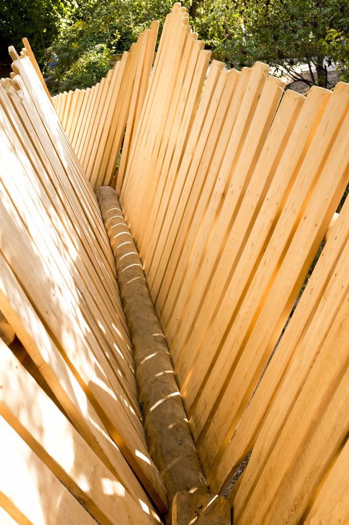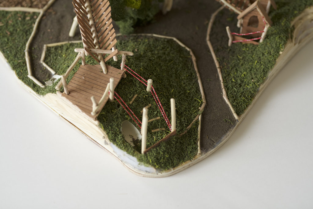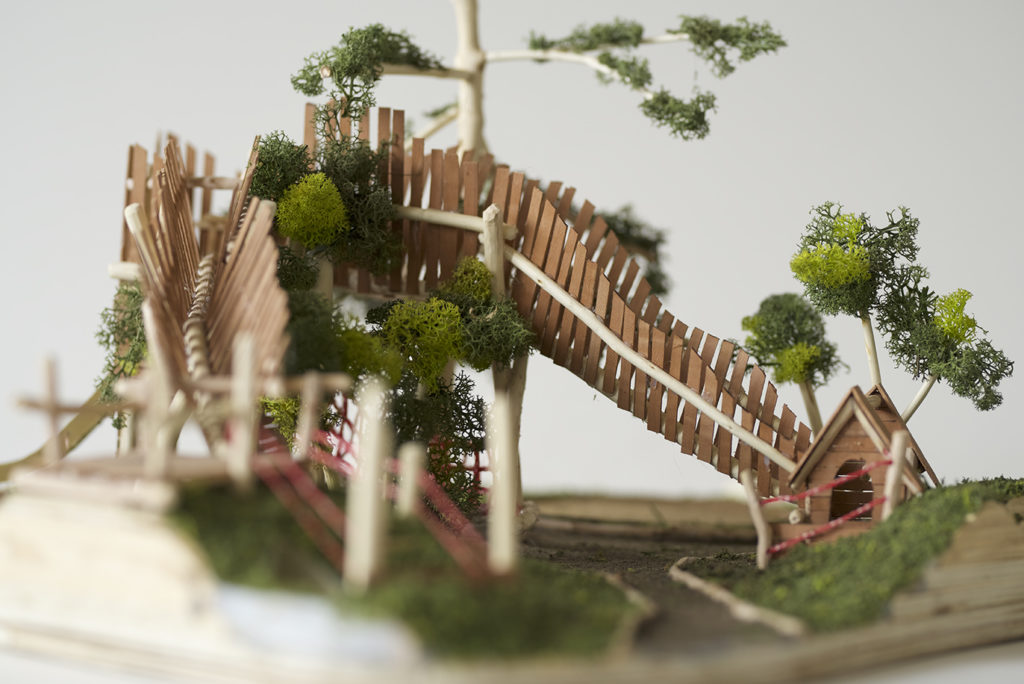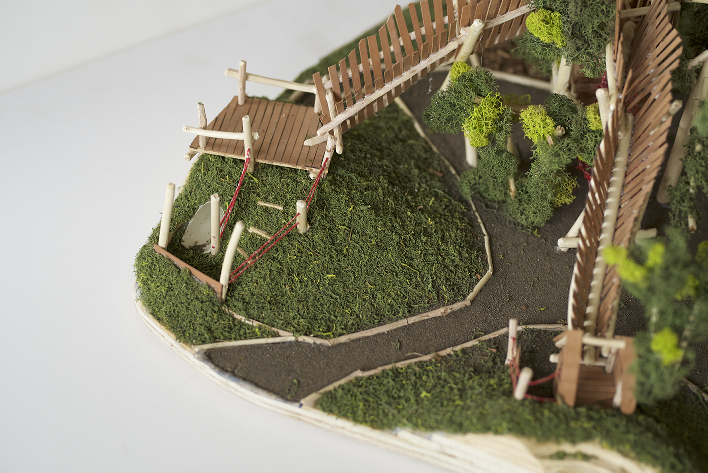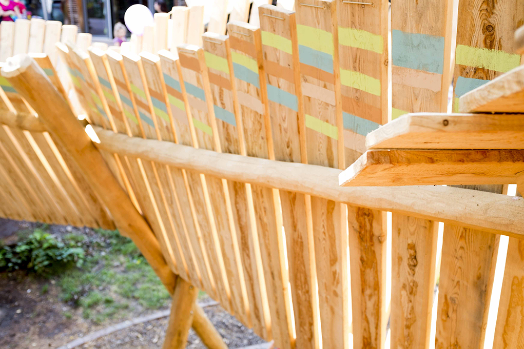 In dem Spielobjekt wurden die neuen Elemente in die bestehende Baustruktur und in die vorhandene Terrasse integriert. Alte und neue Elemente verschmelzen zu einer Einheit. Durch diese Erweiterung wurde die gesamte Spielfläche verdoppelt und es entsteht eine völlig neue Perspektive zum Garten. Die Kinder sollen im Spiel die Höhe und auch ihr Empfinden für den Raum sensibilisieren. Das Objekt besitzt verschiedene Ein- und Ausgänge und diverse Strecken. Es ist so konzipiert, dass die Kinder dabei in Kontakt kommen, sich berühren, aneinander vorbeilaufen (Kontaktspielgerät). Es lädt zum Verstecken und zum Entdecken ein.